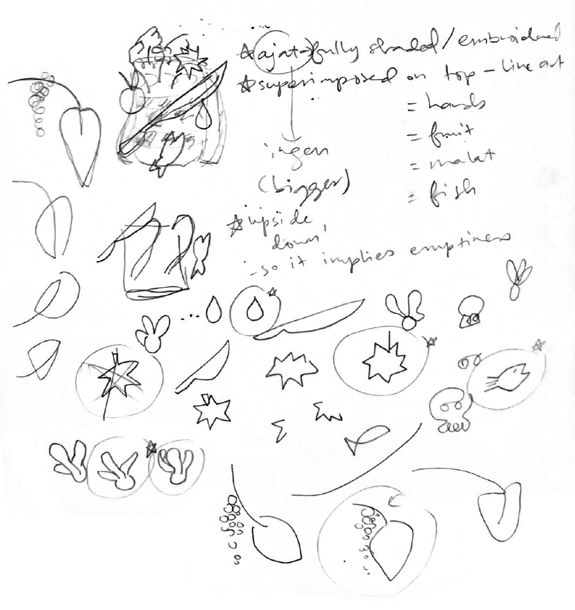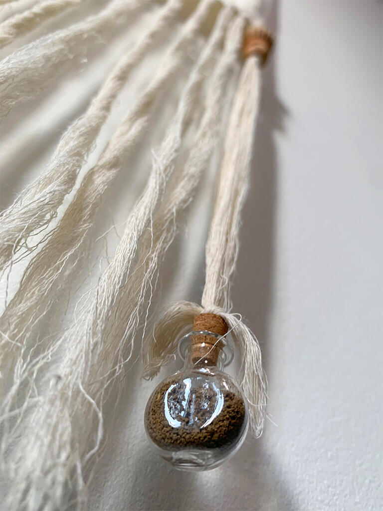 This piece explores the future of humanity and how it relates to the environment. As a Kayan person, I believe that the natural world is inseparable from culture, so in a conversation about climate change, we have to speak about Indigenous heritage as well. We are losing Indigenous knowledge, we are losing recipes for environmental stewardship. The empty, upended ingen—the Kayan word for a big woven basket used to carry produce back from the farm—with brittle bones and crude imitations of bounty spilling out of it was how I captured this anxiety about the future of humanity. The embroidery thread, which I dyed with onion skin, roselle flowers, and coffee, will eventually fade. The little jars of dirt anchoring the tapestry on the left and right: Santubong to the West, Sungai Asap to the East. Unglazed beads from Lawas, raw and incomplete. Crude depictions of durian, engkabang, black pepper; almost as if the artist was trying to draw them based on second hand accounts instead of real life—each of these elements reflects the anxiety I have about the future. But perhaps there is a glimmer of hope. Nothing is truly dead until we stop talking about it or recreating it. So maybe this is me trying to create a future I would like to see. A future where indigenous knowledge and values are part of the conversation: honoured, vital, and alive.