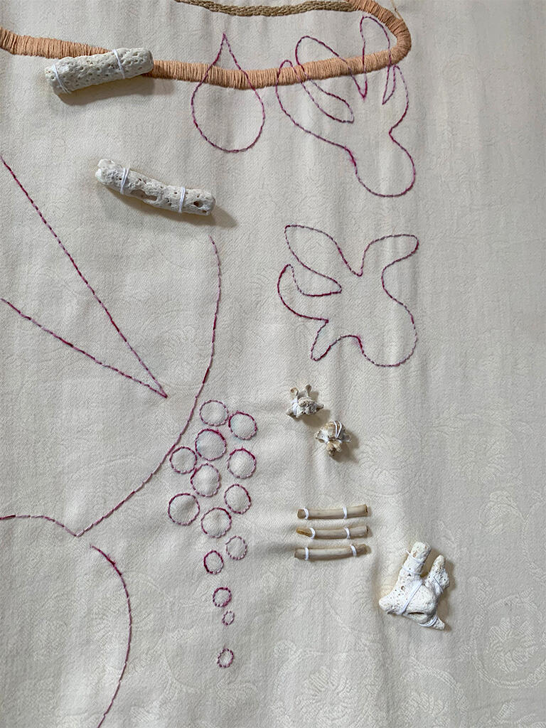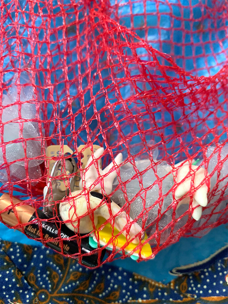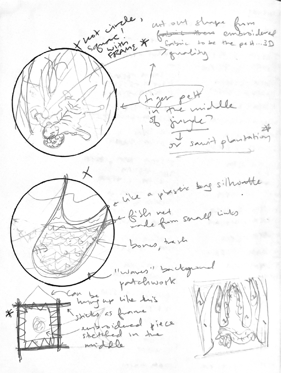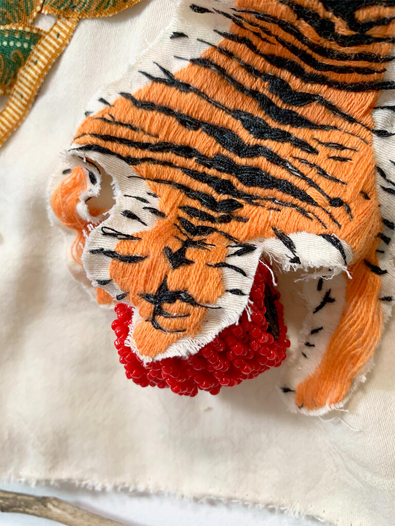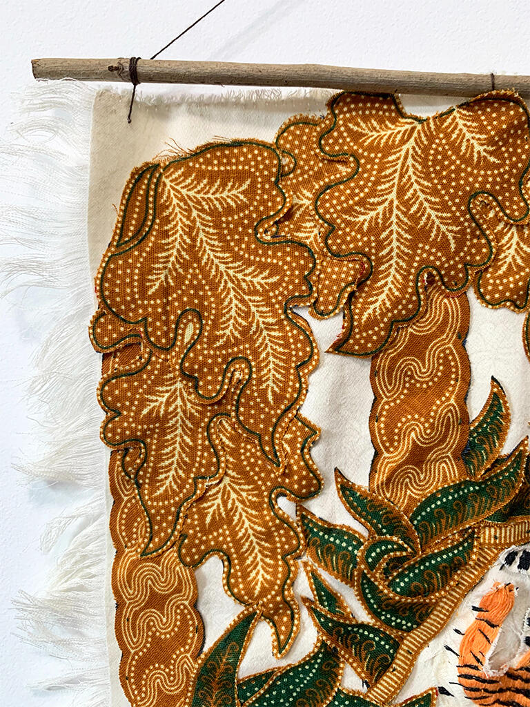 These two pieces were made to complement each other, hence their names: Tanah & Air. I’ve had this image of a tiger pelt in an oil palm plantation—a visual analogy to habitat loss and animal extinction due to deforestation—in my head for a long time, but I was unsure how to execute it. In the end I decided on this mixture of embroidery, appliqué, and assemblage, but using elements that we as Malaysians are more familiar with. The oil palm trees and leaves are made from cut out batik motifs, the oil palm cluster is represented by a kabo bead, a significant culture identifier for the Orang Ulu community. The contrast between the dark subject matter and the bright, almost innocent way it’s portrayed is something that I enjoyed playing with. It reflects that certain blithe ignorance we all face when speaking about the impacts of deforestation or pollution.Air was made using similar methods to Tanah, but with more recycled and repurposed materials: the fishing net is old fruit packaging, the catch of the day being various bits of debris and trash I’ve collected. The composition brings to mind illustrated children’s storybooks, which begs the question: in a hundred years from now, what kind of stories will we be telling our kids about the Earth, the environment, and our role in preserving—or destroying—it? Will these vignettes be our reality one day? Or will they remain cautionary tales?